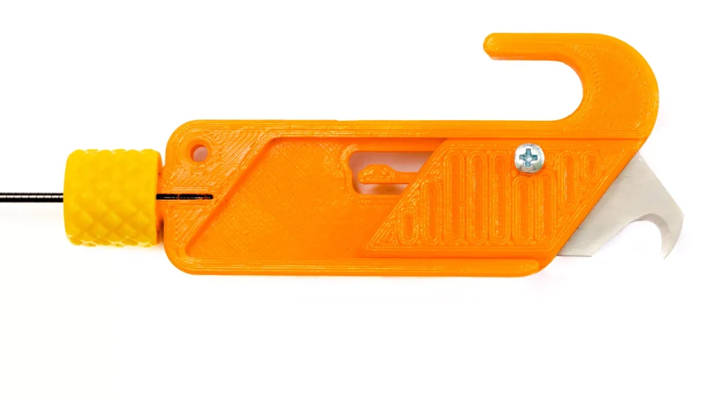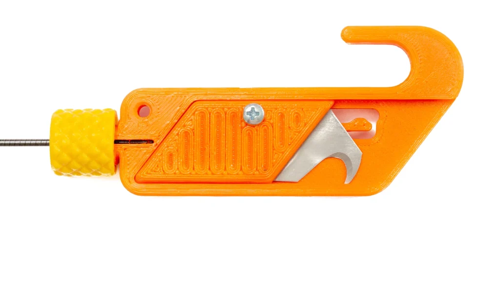 The tool shown in the picture is a 3D-printed cutting head designed specifically for radiosonde hunting. Its body is made of orange ABS plastic. It is conspicuous, light, and large enough not to disappear immediately in grass, leaf litter or outdoor terrain.