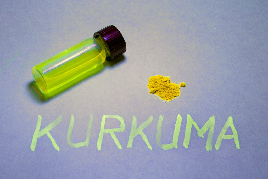 To extract the dye, soak a teaspoon of turmeric in 2–3 teaspoons of 96% ethanol overnight, then filter. The solution makes an effective secret ink. It’s hard to wash off—your fingers may glow after cleaning wiht soap too. To use it in a fountain pen, dilute 3–5 parts of the solution with 95 parts distilled water. Avoid floating particles—they clog pens. Store the ink in a dark place in a brown bottle. Even so, it won’t last more than a few weeks. More durable fluorescent inks, like those used on banknotes, are inorganic and much more expensive.