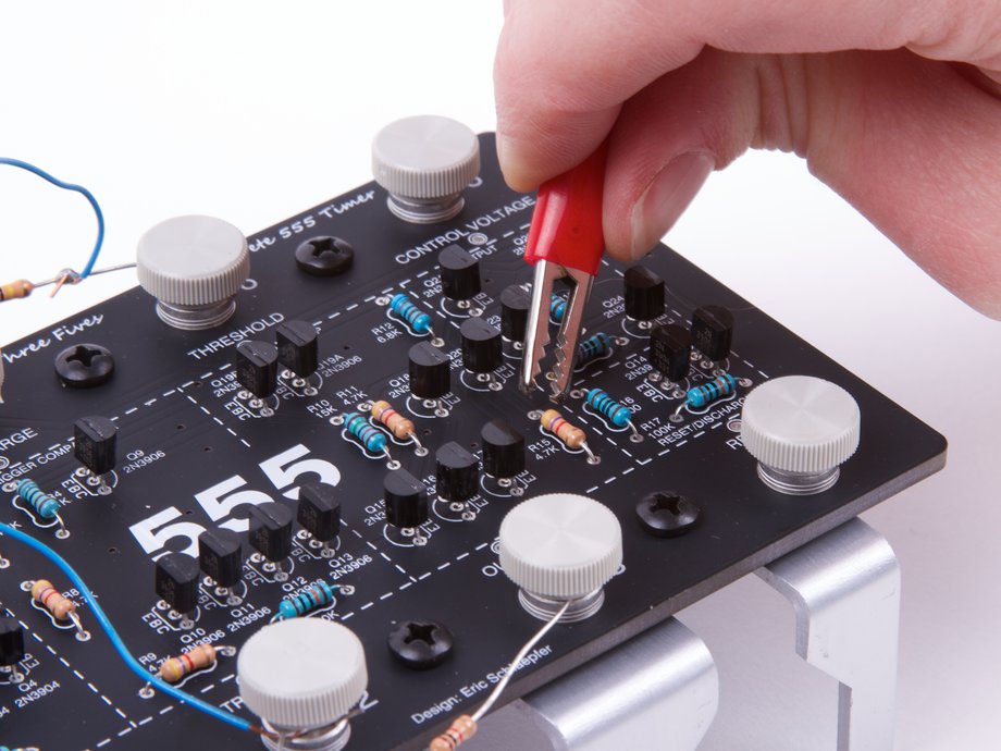 You can build all sorts of things with the NE555, but who on earth would think of building the NE555 itself? Well, at Evil Mad Scientist Laboratories, it was Eric Schlaepfer who designed a $35 kit that lets you assemble a functional NE555-equivalent circuit out of discrete transistors — on a board shaped like an 8-pin DIP package (though, of course, much larger).
