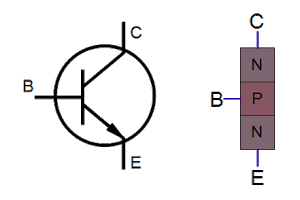 C stands for collector, B for base, and E for emitter. This is an NPN transistor because it consists of two n-type and one p-type layers. If you don’t yet understand how a transistor works, for now it’s enough to know that it’s a kind of switch: the current applied to the base controls (or switches) the current flowing between the collector and the emitter.