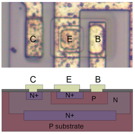 Now, in reality, the internal structure of a transistor inside an IC is a bit more complex than the simplified diagrams found in textbooks. For example, one of the transistors in the NE555 looks like this under a microscope, viewed from above, and like this in a simplified cross-sectional side view: