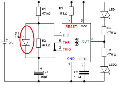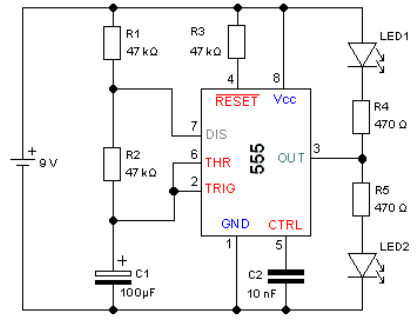 It’s logical to omit the S1 switch and connect the Trigger input directly to the capacitor. To allow discharging, we add another resistor. In this configuration, the capacitor charges through resistors R1 and R2 up to 2/3 Vcc, then discharges through R2 toward pin 7 down to 1/3 Vcc. The capacitor voltage oscillates between 6 V and 3 V, and the two comparators toggle the flip-flop back and forth. The LEDs blink alternately — this is the astable multivibrator circuit.