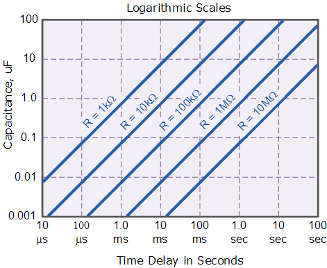 The length of the timing interval depends on the values of resistor R2 and capacitor C1. The formula was given above next to the schematic, but the nomogram below can also be used to determine the timing values: