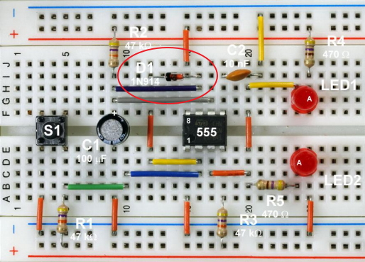 With the following circuit, you can try out how the flip-flop works! In the default state, the Trigger input (pin 2) is pulled up to the supply voltage by resistor R1. When button S1 is pressed, the input drops to 0 V (which is less than 1/3 Vcc = 3 V), causing the flip-flop to set. A positive voltage appears on pin 3, which drives current through resistor R5 and LED2 — so LED2 lights up. LED1 remains off, because pin 3 is now near the supply voltage, and there’s virtually no voltage difference between the positive terminal of the 9V battery and pin 3.