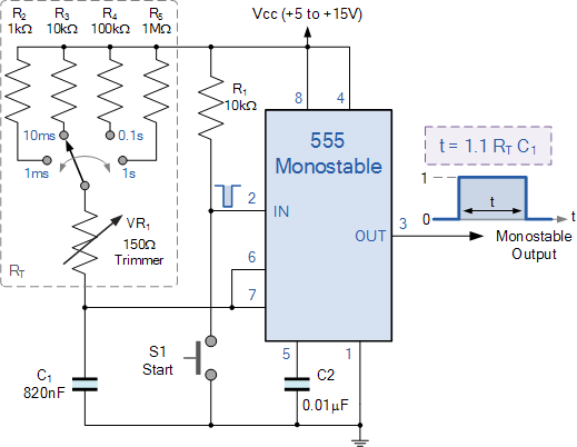 As you can see, the same time interval can be achieved using different combinations of resistance and capacitance — we have many options to choose from. In practice, C1 typically ranges between 0.001 µF and 100 µF, while R2 can be selected anywhere between 1 kΩ and 10 MΩ. If we want to select from multiple timing intervals within a circuit, we can use several resistors and switch between them with a selector switch. Another option is to replace R2 with a variable resistor (potentiometer). These two methods can also be combined: