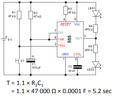 t₁ = 0.693 × (R1 + R2) × C1 = 0.693 × (47,000 Ω + 47,000 Ω) × 0.0001 F ≈ 6.5 sec