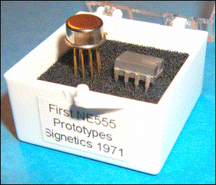 The IC contains 25 bipolar transistors, 2 diodes, and 15 resistors on a silicon chip in an 8-pin DIP package. The prototype was manufactured in October 1971, and by the summer of 1972, 12 major electronics companies were already producing it. It became the most successful integrated circuit of all time. Later, a dual version appeared under the model number NE556 in a 16-pin package (containing two full NE555 circuits), followed by low-power CMOS versions such as the Intersil ICM7555 or the Texas Instruments LMC555. A version containing four timers was also made under the model number NE558.