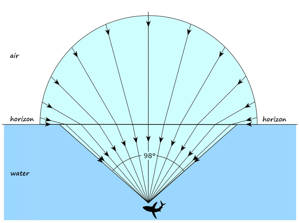 Within a cone of about 98° (or 96–97° in seawater), the fish can see the entire world above the water’s surface.