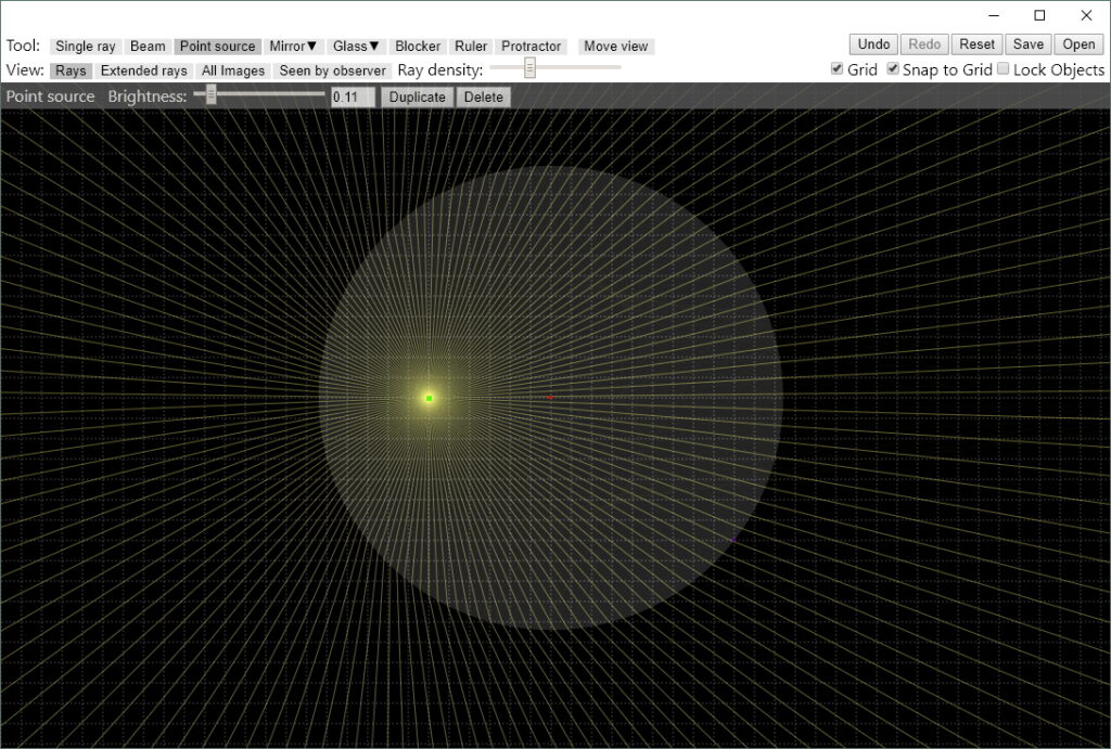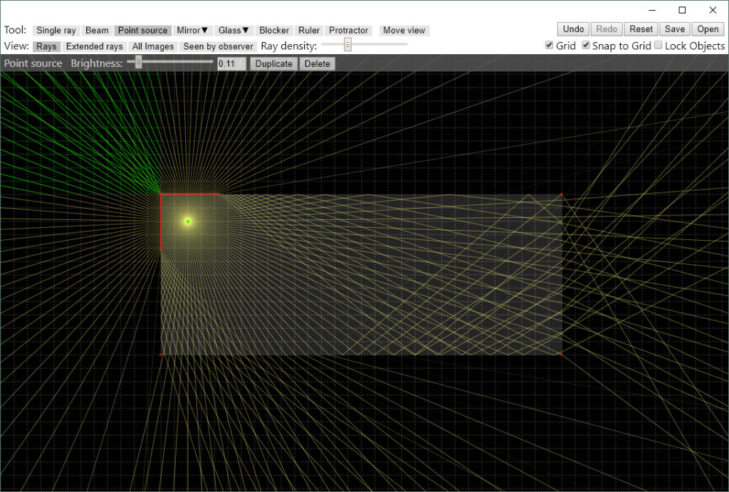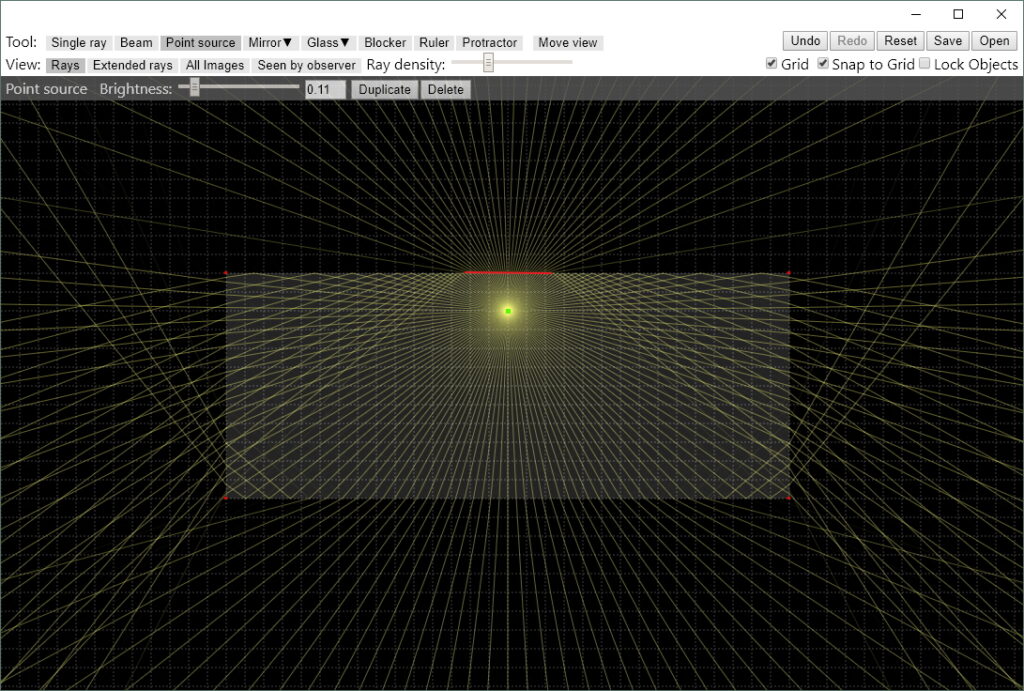 So, instead of a fish, choose Point source from the Light Source menu and place a point light source inside the aquarium close to one of the walls! On the top set the Ray density slider to make the program display plenty of rays.