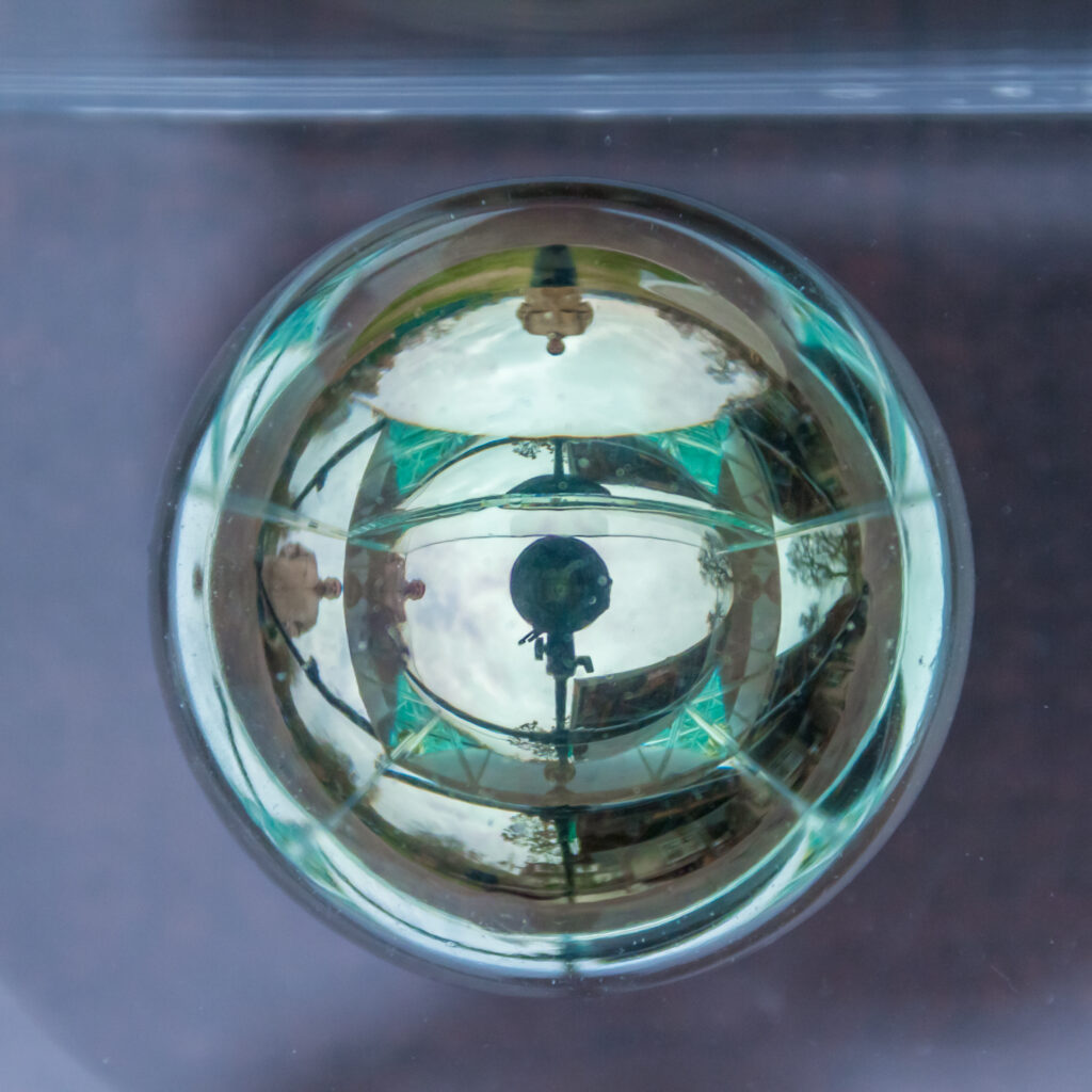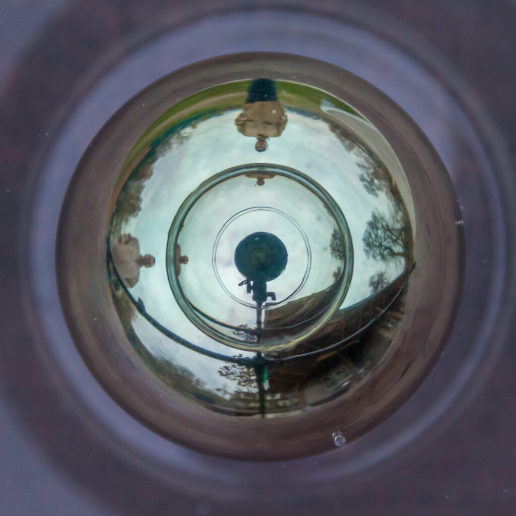 When the mirrored sphere is placed in the spherical aquarium, the reflection shows a relatively normal circular panorama. The water surface is, of course, still flat, so there remains a Snell’s window at the top, in which objects near the edge appear doubled. In practice, however, serious spherical aquariums come with a lid, lighting, and water filter, which completely covers this upper window, making it disappear.