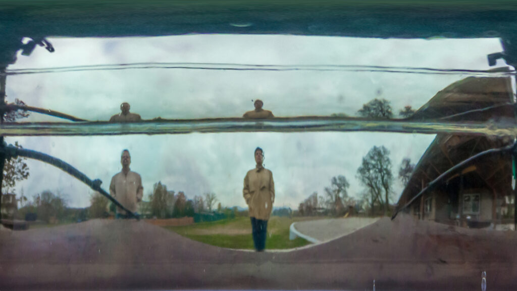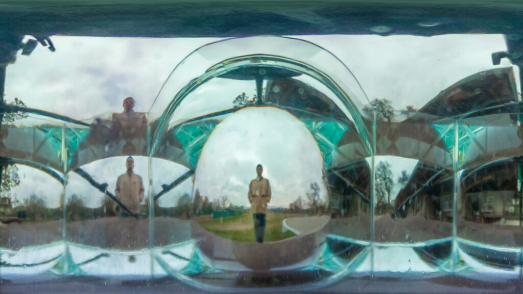 From the spherical aquarium, a relatively normal circular panorama is visible, with image doubling occurring only at the edge of the upper water surface.