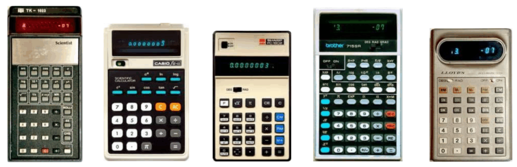 From the late 1970s onward, countless models of pocket calculators flooded the market. Ambitious companies such as Casio, Motorola, Sharp, and later Commodore—better known for its computers—joined the industry. The largest online calculator database, MyCalcDB, lists 668 brands and over 7,000 models.