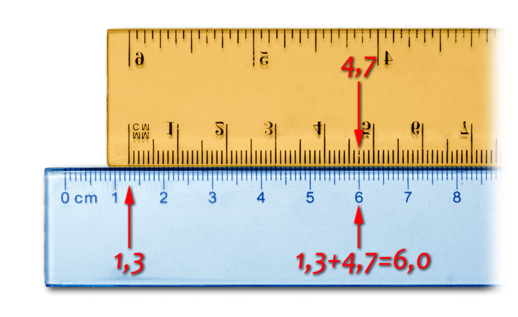 The principle of the slide rule is simple. Put two rulers side by side with their zeros aligned. Let’s “calculate” 1.3 + 4.7. Slide one ruler so its zero aligns with 1.3 on the other ruler. Then find the 4.7 mark on the second ruler and read the number opposite it on the first ruler: it will be 6, because the two lengths add up. A slide rule works the same way—except not for addition, but for multiplication. The trick is that the logarithm of a product equals the sum of the logarithms: