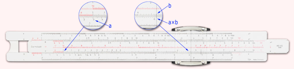 If the rulers’ scales are logarithmic rather than linear, you can multiply with them. The basic scales, labeled C and D, run from 1 to 10. To multiply 1.3 × 4.7, align the movable inner scale’s 1 with 1.3 on the fixed scale, then read the result at 4.7: about 6.11. If it doesn’t fit on the scale, use the other end (10) as the starting point and shift left. Whether it’s 1.30 × 4.70, or 0.13 × 0.047, or 1300 × 470, the process is the same. You must express numbers as A.AA × 10^X and B.BB × 10^Y, and add the exponents in your head, adjusting by 1 whenever the cursor runs off the left end.