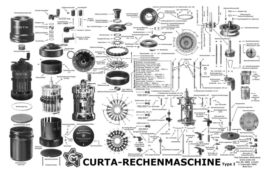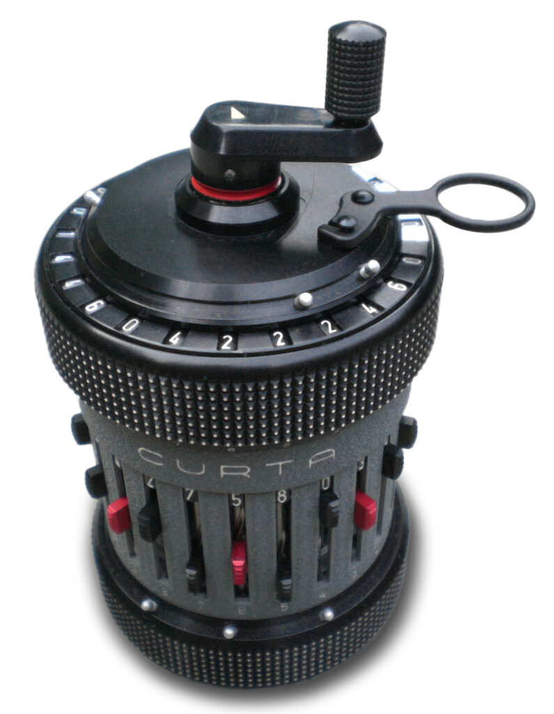 In the 1930s, young Curt Herzstark began designing a pocket-sized calculator. This was the Curta. Completed in 1948, it looked like a tiny pepper grinder. You entered numbers via sliders on its side; after turning a crank, the result appeared on top. Besides the four basic operations, it could square, extract roots, and compute negative powers. It was made until 1972, with 150,000 units sold for $125–175 each. Electronics killed it, and the company went bankrupt. Today the Curta enjoys a renaissance; see www.curta.de for original manuals and a working simulator. Rumors of $30 Chinese replicas are false—you can’t make such a fine mechanism of 600+ tiny parts cheaply. Real units sell for over €1200–1800 on eBay.