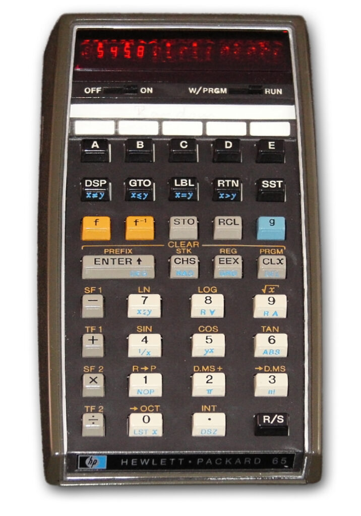 In 1974, Hewlett-Packard launched the HP-65 at $795 (about $3,770 today), likely the most expensive pocket calculator ever. It gained fame for being used on the 1975 Apollo–Soyuz mission. Its red, 12-digit LED display showed only stick-like digits, no letters. It could be programmed with up to 100 steps, and programs could be stored on magnetic cards. Not the first electronic pocket calculator, but perhaps the most iconic.