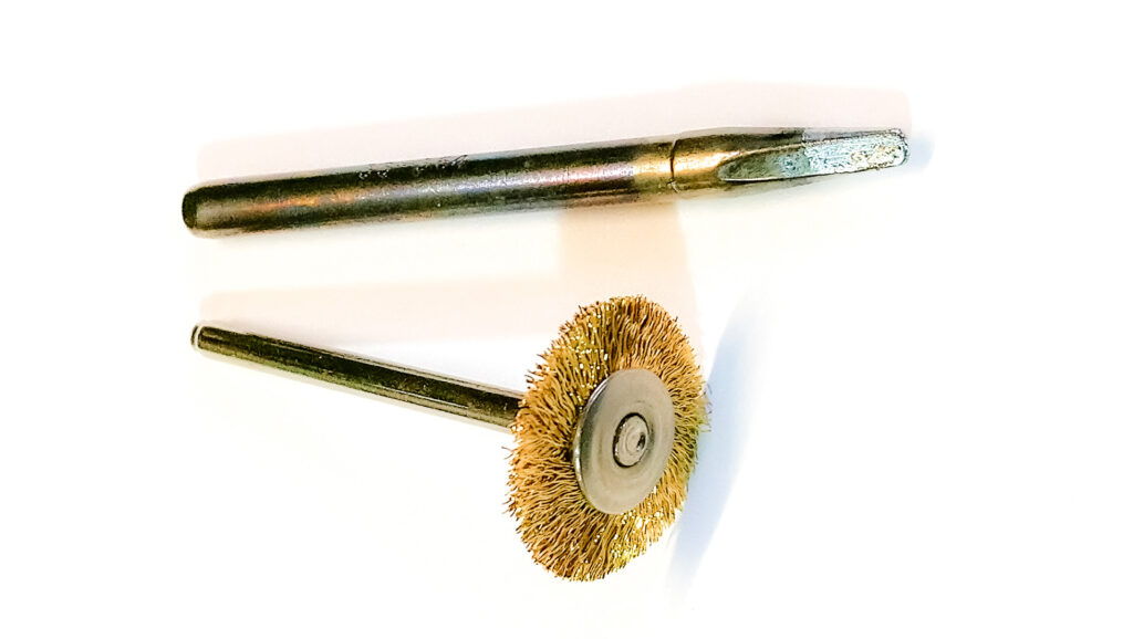 The baked-on oxide layer should first be removed mechanically. The best tools for this are fine copper shavings, a copper brush, or — for stubborn grime — a brass wire wheel mounted in a drill (make sure it’s actual brass, not just copper-coated steel!).