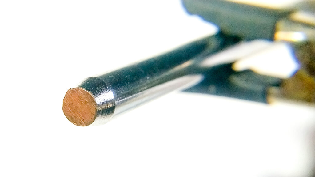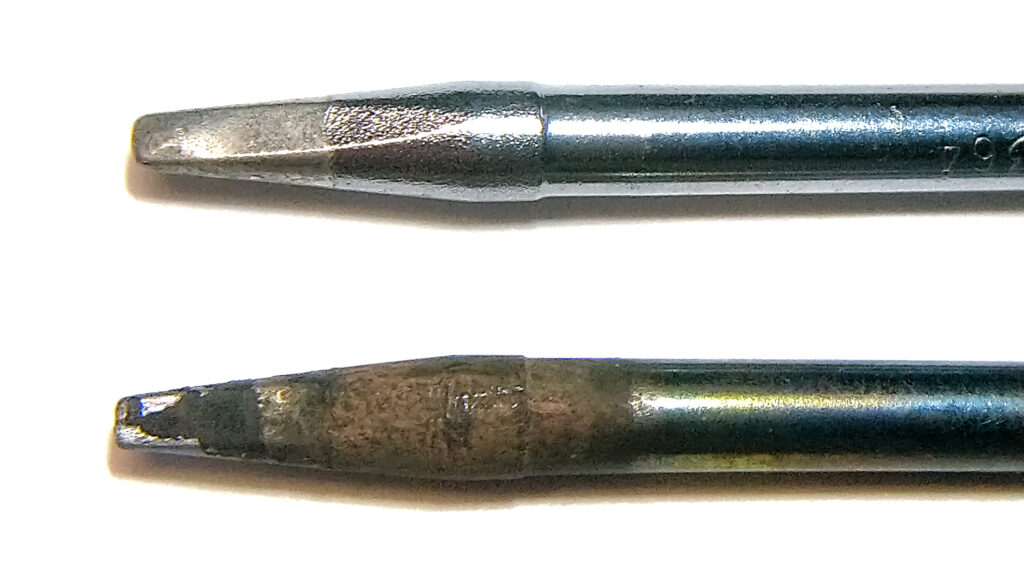 The problem was that copper dissolves into the solder, causing the tip to visibly wear down over time (this is why the old “instant” soldering iron tips eventually broke). Copper contamination also raised the solder’s melting point, resulting in uneven, porous, low-quality joints.