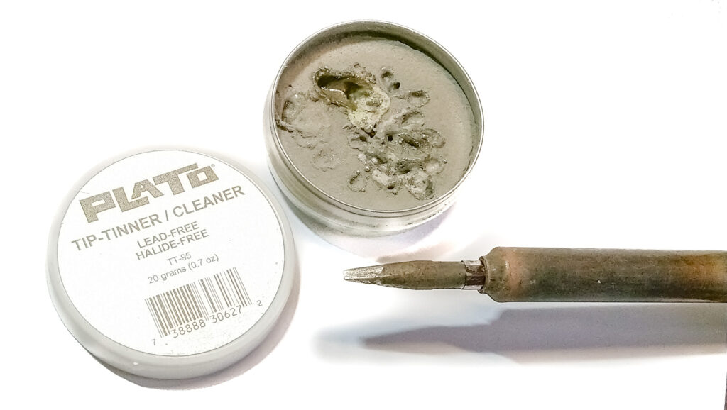 Don’t expect the tip to be perfectly clean just after brushing — it’s enough to remove the bulk of the crust. The next step is to use soldering tip cleaning paste.
