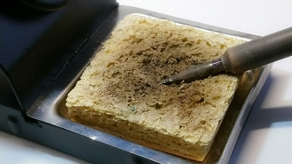 During work, you should occasionally wipe the soldering tip — typically using the damp sponge attached to the soldering iron stand. For beginners (though this might be obvious): only use a proper tip-cleaning sponge (or in fact, any natural sea sponge). Plastic sponges (like kitchen scrubbers) are unsuitable — they melt.