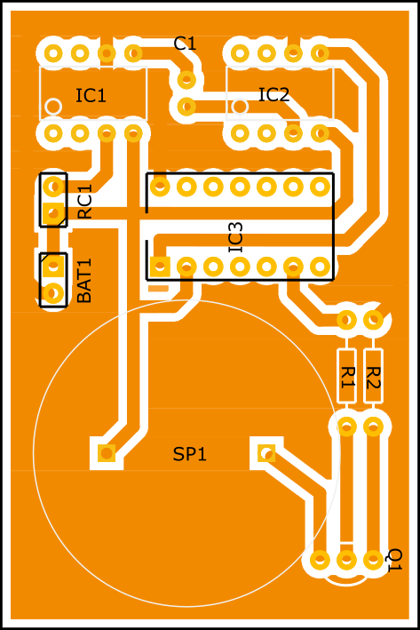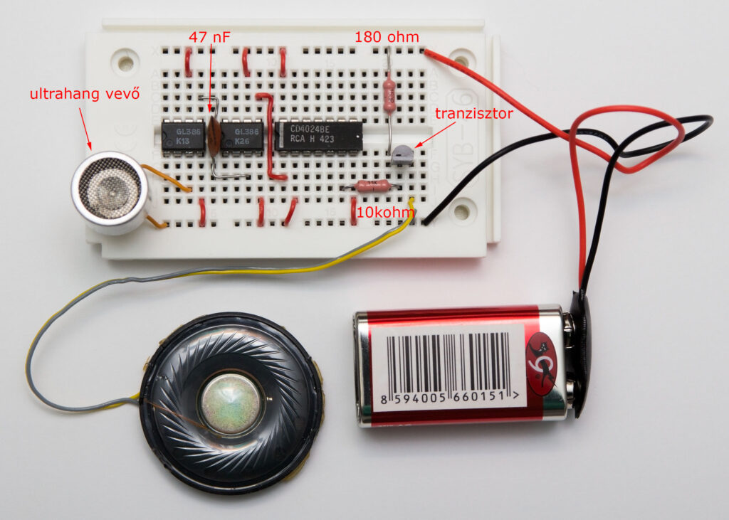 When the ultrasonic receiver detects a bat call, the speaker produces the characteristic clicking or chirping sound, which is audible to the human ear. The circuit’s output can also be connected to a computer’s audio input (in that case, the transistor is not needed), allowing you to record the sounds.