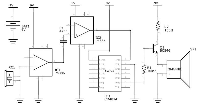 The circuit contains two amplifier ICs and a frequency divider. The signal from the capsule (RC1) goes to pin 3 of the first integrated circuit (IC1), an LM386. This IC is actually designed to be a low-voltage audio power amplifier for small speakers. We are not using it for its intended purpose, but it’s perfectly suitable for our needs, because it allows us to implement the input amplifier stage without any additional external components. Anyone who wants more details can easily find the relevant datasheets with a quick Google search.