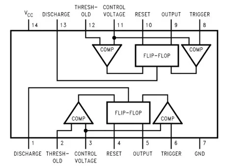 The NE556 is a 14-pin IC containing two precision timers, each functionally equivalent to an NE555. It can be used in a variety of applications. (You can read more about the NE555 here.) You can download the NE556 datasheet online; the pin functions are shown in the diagram below: