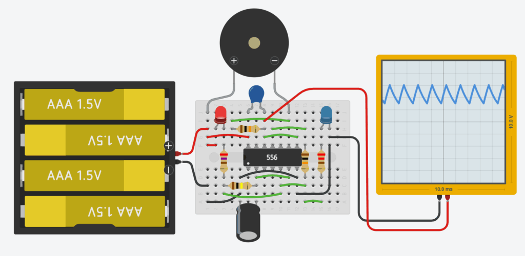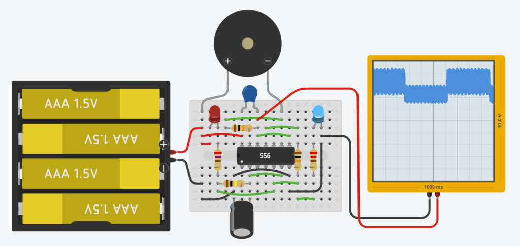 A popular variant of the well-known NE555 timer IC is the NE556, which contains two timers. With this IC, you can build a simple siren. This siren alternates between two tones, similar to old police car sirens, while also flashing a blue and a red LED. You can test the circuit in Tinkercad: