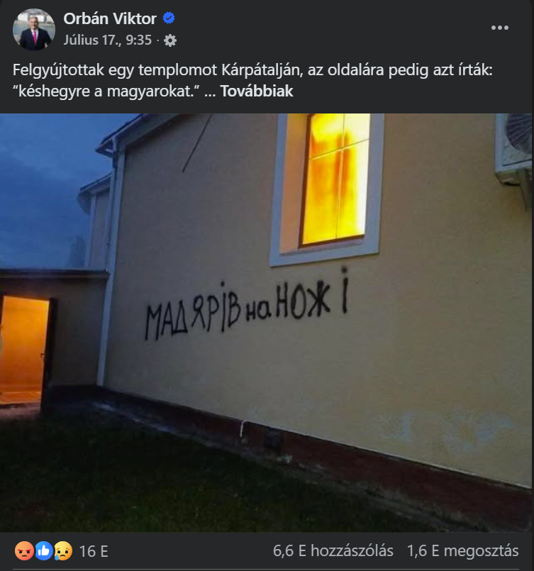 Lately, the Hungarian press has been full of reports that the Ukrainian Security Service (SBU) and the Ukrainian police have arrested a 28-year-old local resident who, on the night of July 16, 2025, set fire to the Greek Catholic church in Palágykomoróc and wrote anti-Hungarian slogans on its wall.