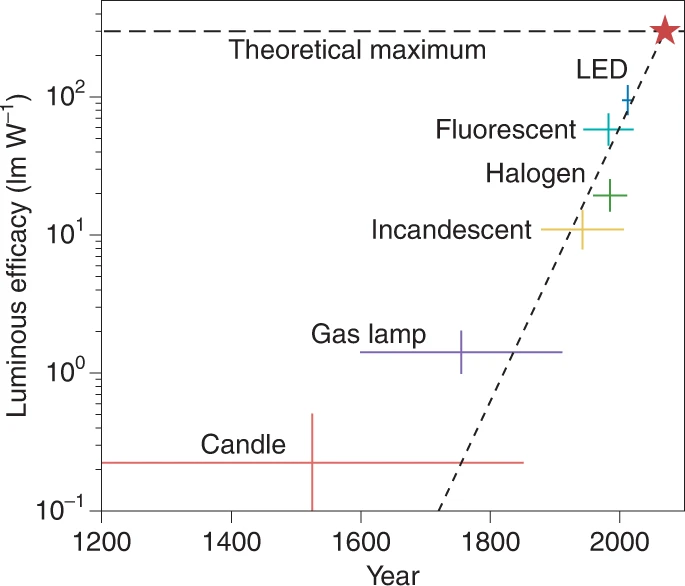 Technological progress is not the key to growth because we’ve already hit hard limits in many areas—lighting included. A standard bulb: about 10–15 lm/W luminous efficacy, meaning 1 watt gives 10–15 lumens. Halogen: 15–20 lm/W. Fluorescent: 80–90 lm/W. A cheap LED: 50–150 lm/W. Notice: the hyped LEDs aren’t much better than fluorescents—just far more resource- and energy-intensive to make (rare earth metals, anyone?). True, fluorescents contain mercury—hence the phase-out—but that’s only an issue because, in half a century, we proved incapable of recycling them instead of tossing them everywhere. So what do we expect?