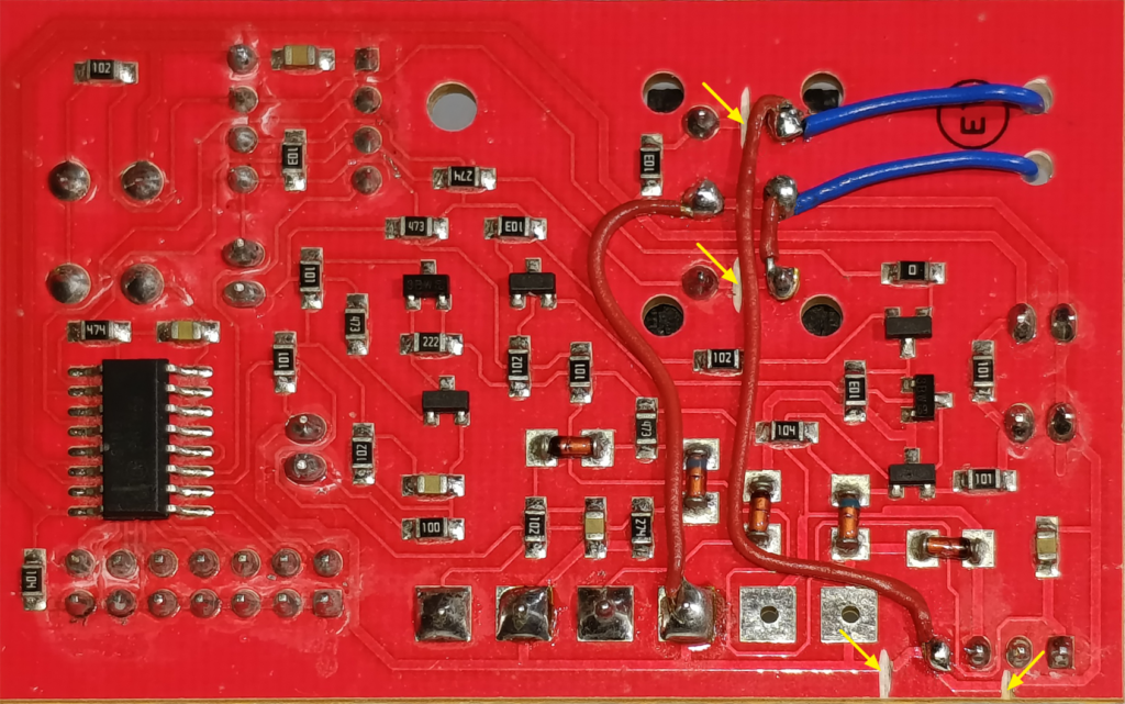 Fortunately, the hook switch is a double-pole, double-throw (DPDT) switch, and one of its terminals is connected to ground—as can be seen in the circuit diagram. There it is shown as a single switch, but in reality, on the PCB, the two switch sections are simply wired in parallel. One half of this switch can therefore be used to bypass the resistor when the handset is lifted. On the printed circuit board, the tracks must be cut at the four locations marked with yellow arrows in the photograph. Then, the three jumper wires shown in the picture must be soldered in place—one to restore the interrupted ground track, and two other to reconnect the loudspeaker.